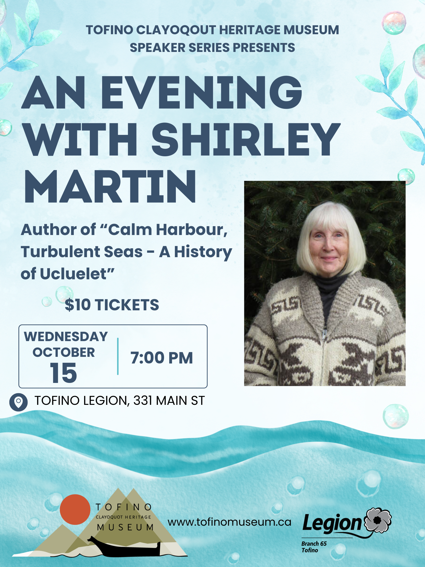 The Tofino Clayoquot Heritage Museum invites you to our new speaker series event featuring Shirley Martin, author of Calm Harbour, Turbulent Seas – A History of Ucluelet.